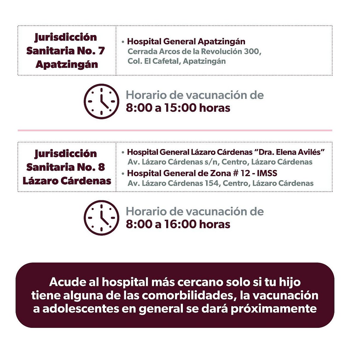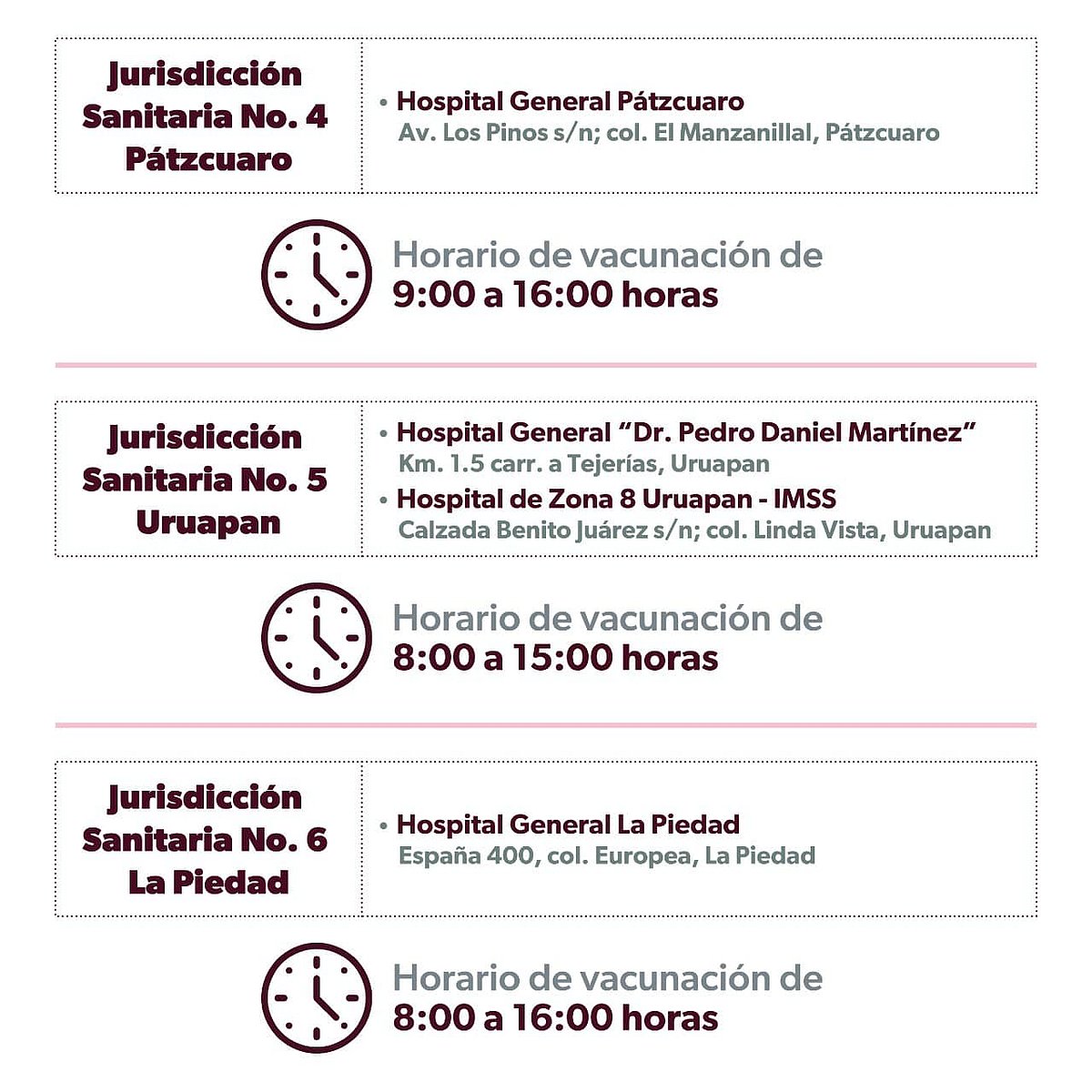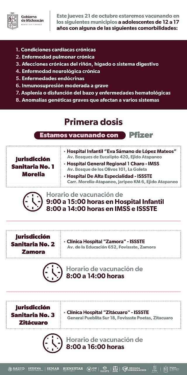 En un comunicado de prensa, la Secretaría de Salud de Michoacán informó que el Consejo Estatal de Vacunación hizo la distribución de las vacunas en las ocho jurisdicciones sanitarias y a los hospitales, a los que deberán acudir los adolescentes, de la siguiente manera y horarios: