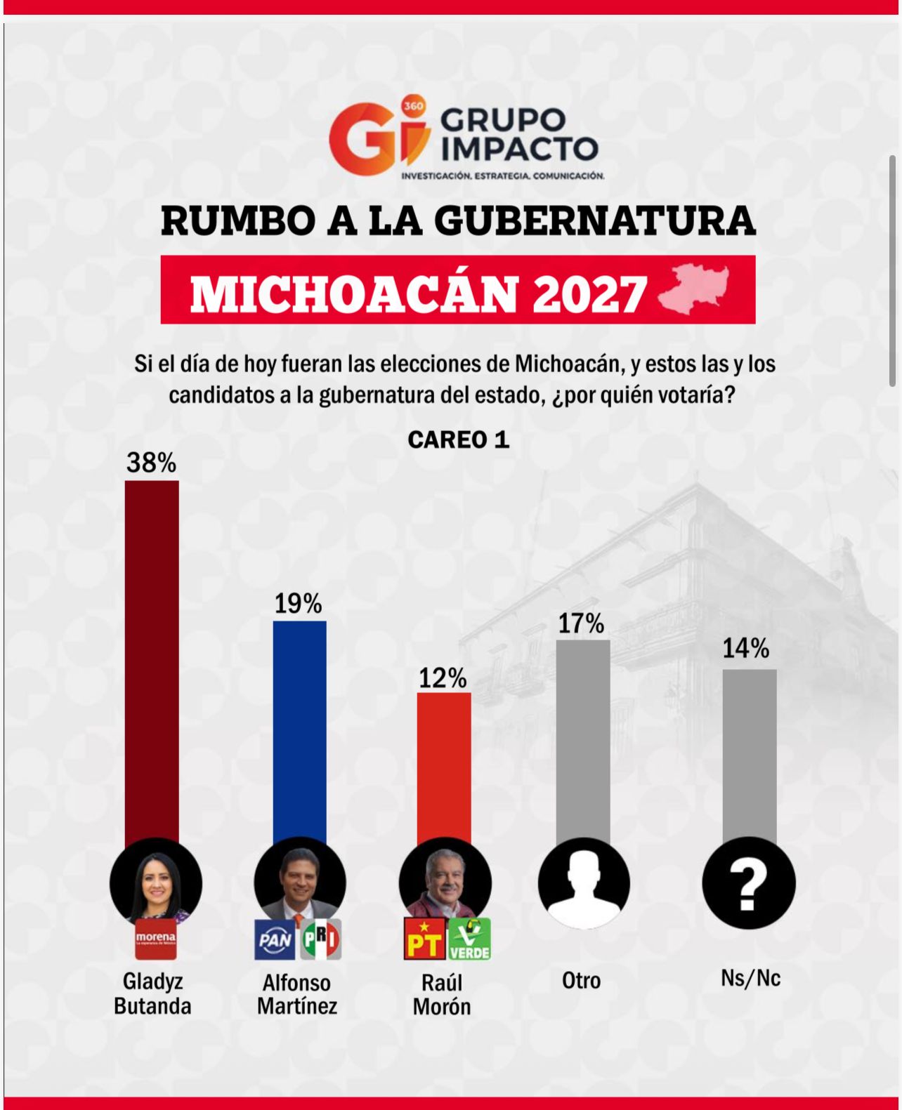 De acuerdo con un estudio de opinión generado por Grupo Impacto, el único aspirante de Morena a la gubernatura que evitaría la continuidad de la 4T en Michoacán es el senador Raúl Morón Orozco, cuyo respaldo electoral va en picada luego de haber sido señalado como uno de los presuntos autores intelectuales del asesinato de Carlos Manzo.
