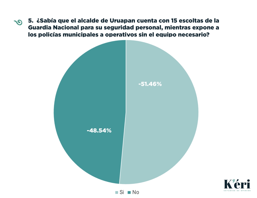 El sondeo, realizado del 19 al 21 de septiembre de 2025 a mil 250 habitantes, también evidenció inconformidad con el hecho de que Manzo disponga de 15 escoltas de la Guardia Nacional, mientras la policía local carece de equipamiento, lo que refuerza la percepción de que el alcalde privilegia su seguridad personal sobre la de la población.