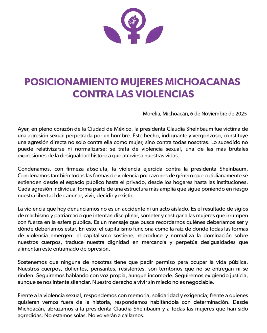 El Posicionamiento de Mujeres Michoacanas Contra las Violencias, firmado por diputadas, presidentas municipales, magistradas, secretarias, académicas y concejeras comunales, denuncia que la violencia sexual no puede relativizarse ni normalizarse, y que representa una de las expresiones más brutales de desigualdad que viven las mujeres.