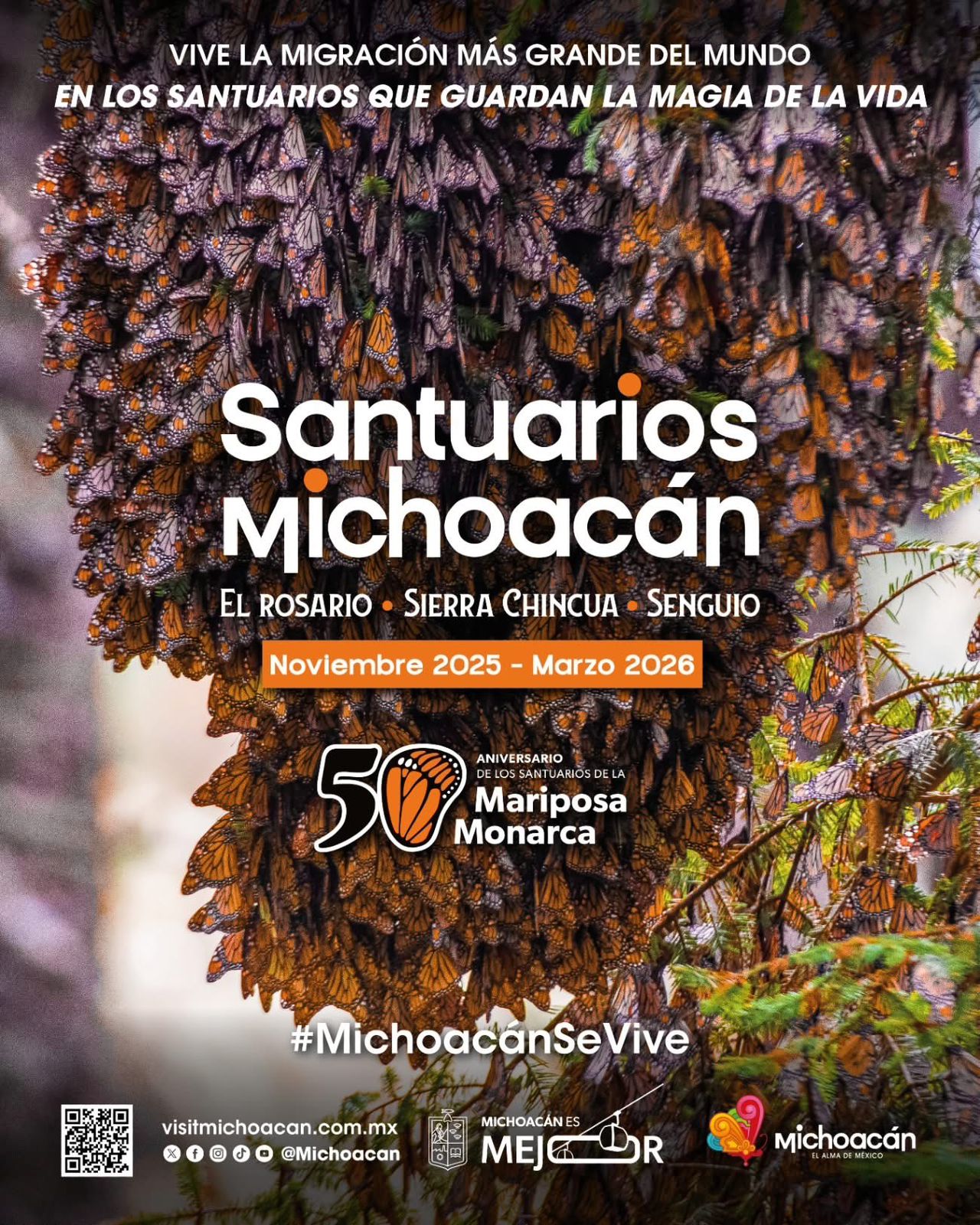 Morelia, Michoacán, 11 de diciembre de 2025.- La temporada de la Mariposa Monarca ya comenzó en Michoacán, y el municipio de Senguio invita al público nacional y extranjero a visitar sus santuario, informó la Secretaría de Turismo del estado (Sectur), dependencia dirigida por Roberto Monroy García.
